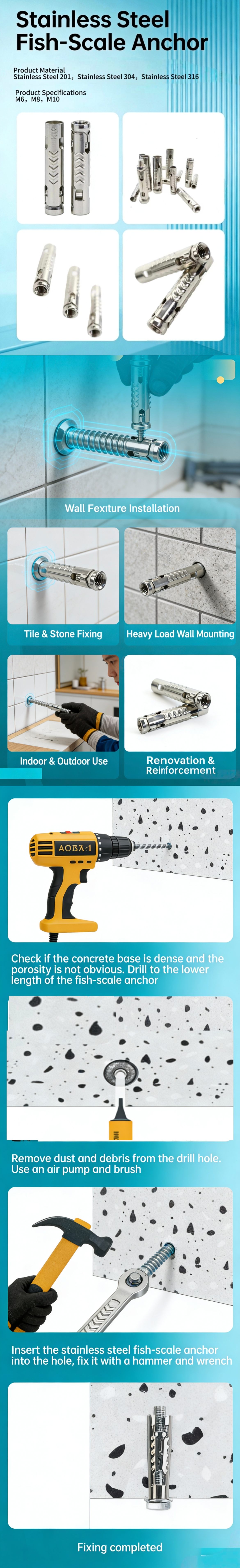 The Stainless Steel Fish-Scale Wall Plug is a high-strength, corrosion-resistant anchor designed for secure wall mounting of tiles, stone panels, wooden fixtures, and other heavy objects. Made from premium stainless steel, it is suitable for both indoor and outdoor use, providing reliable support in renovation, reinforcement, and construction projects. Its unique fish-scale design ensures strong grip and stability, making installation quick and safe across a variety of wall materials. Ideal for kitchens, bathrooms, commercial spaces, and high-load applications.